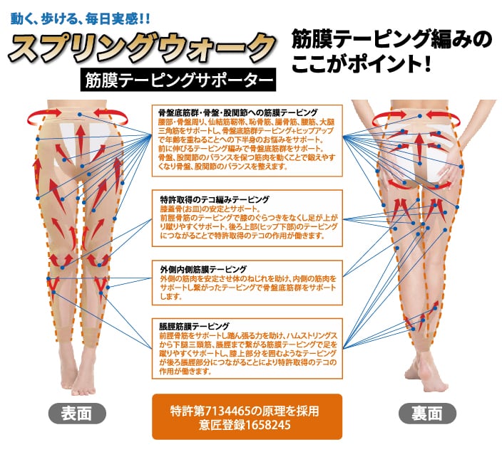 繋がった15m以上にも及ぶ筋膜に沿ったテーピングで内転筋、内側、外側広筋、前脛骨筋をサポートし踏ん張る力を助け、ハムストリングスから下腿三頭筋、脹脛まで繋がるテーピングで足を蹴りやすくサポートし、外側の筋肉を安定させます。また、内側の筋肉から繋がったテーピング編みで骨盤底筋群をサポートします。腰部・骨盤周り、中殿筋、大殿筋、仙結節靭帯、恥骨筋、腸骨筋、大腰筋、大腿四頭筋、骨盤底筋群、骨盤、股関節への筋膜テーピングで年齢を重ねることでのお悩みまでサポートします。筋膜テーピングでお尻のお肉を押し上げ、前に伸びるテーピング編みで骨盤底筋群をサポート。骨盤股関節のバランスを保つ筋肉を動くことで鍛えやすくなり骨盤股関節のバランスを整えます。
